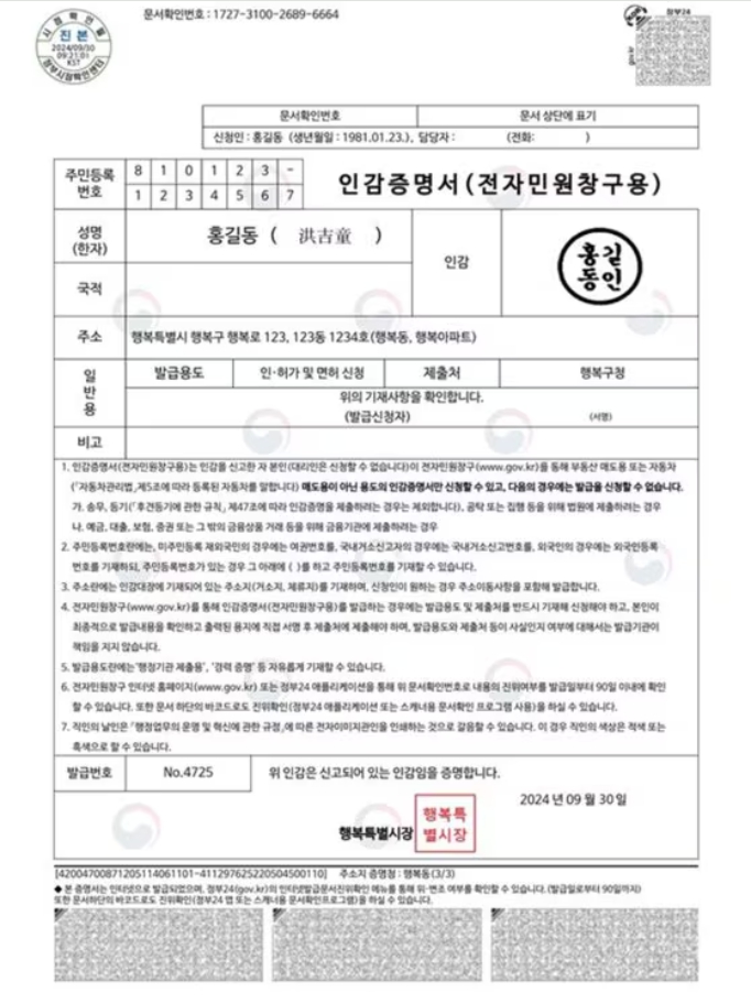 위조,변조 장치도 도입하여 인감증명서 상단에 있는 16자리 문서 확인 번호를 정부24 홈페이지에 입력하거나 하단에 있는 바코드를 정부24 앱에 스캔하여 확인 할 수 있다고 합니다.
