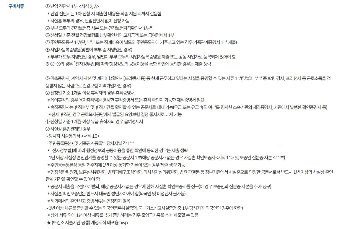 - 불임진단 - 난임 치료를 요하는 의사의 '난임진단서' 제출자가 지원할 수 있습니다. 난임 진단서는 난임 치료의 필요성을 증명하는 역할을 하며 의료 지원이 필요한 사람들에게 재정적 지원이 닿을 수 있도록 보장합니다. 이 밖에 부부 중 최소 한명은 주민등록이 되어있는 대한민국 국적 소유자이면서, 부부 모두 건강보험 가입 및 보험료 고지 여부가 확인이 되어야합니다. 그리고 법적 혼인상태에 있는 난임 부부 뿐만 아니라 사실혼 관계도 신청 가능합니다. 단 사실혼의 경우 난임 시술 2회차부터 신청 가능하며, 최초 신청의 반드시 관할 보건소에 방문하여야지만 신청 자격을 얻을 수있습니다.
